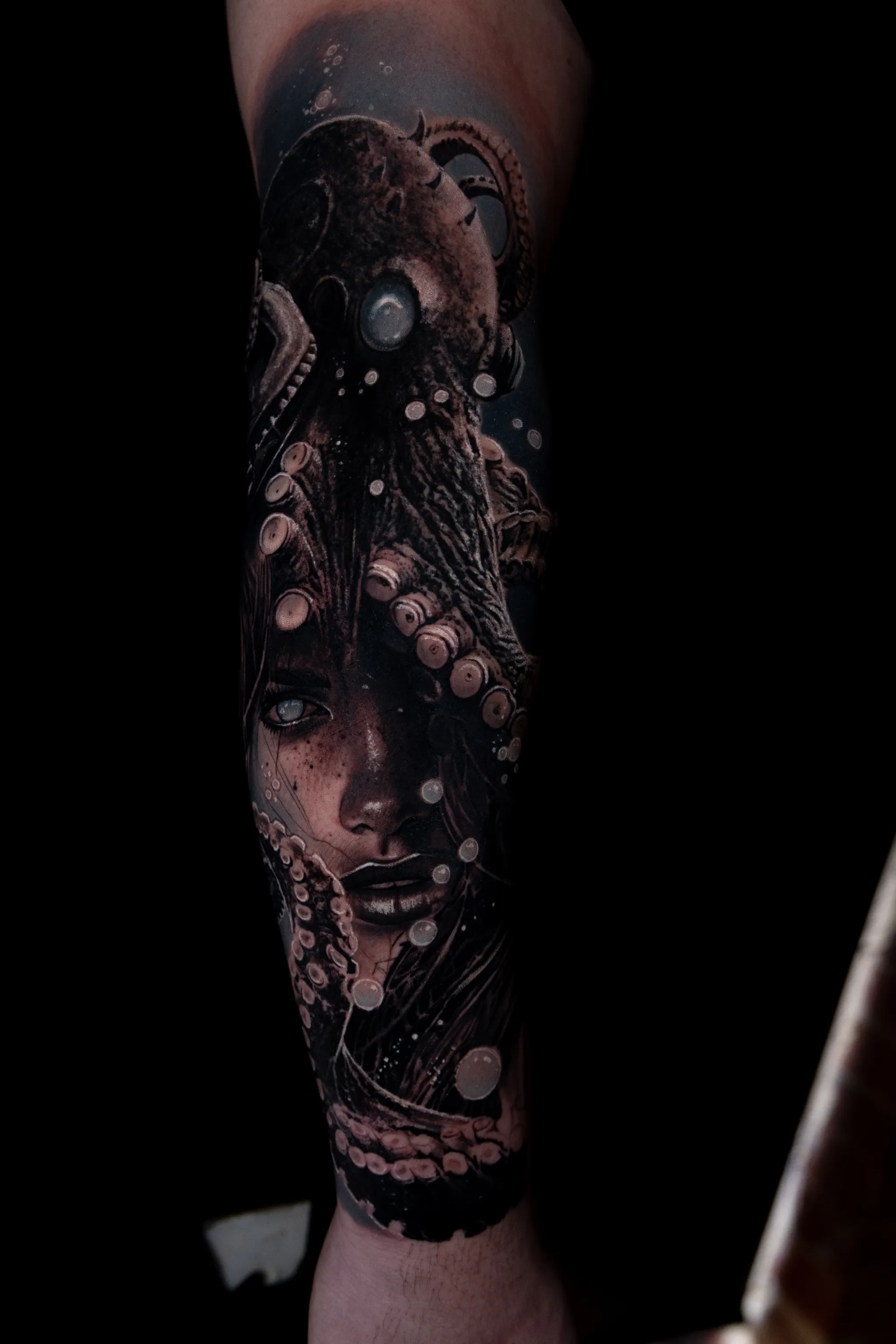 Based in Victoria, Brad is best known for his black and grey realism, crafting tattoos that balance technical mastery with striking depth and tone. His work showcases the power of clean contrast and fine detail from portraits to dynamic custom pieces.