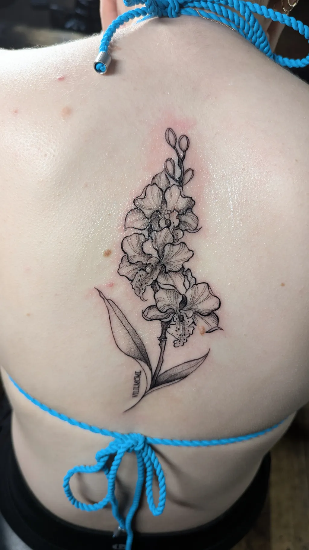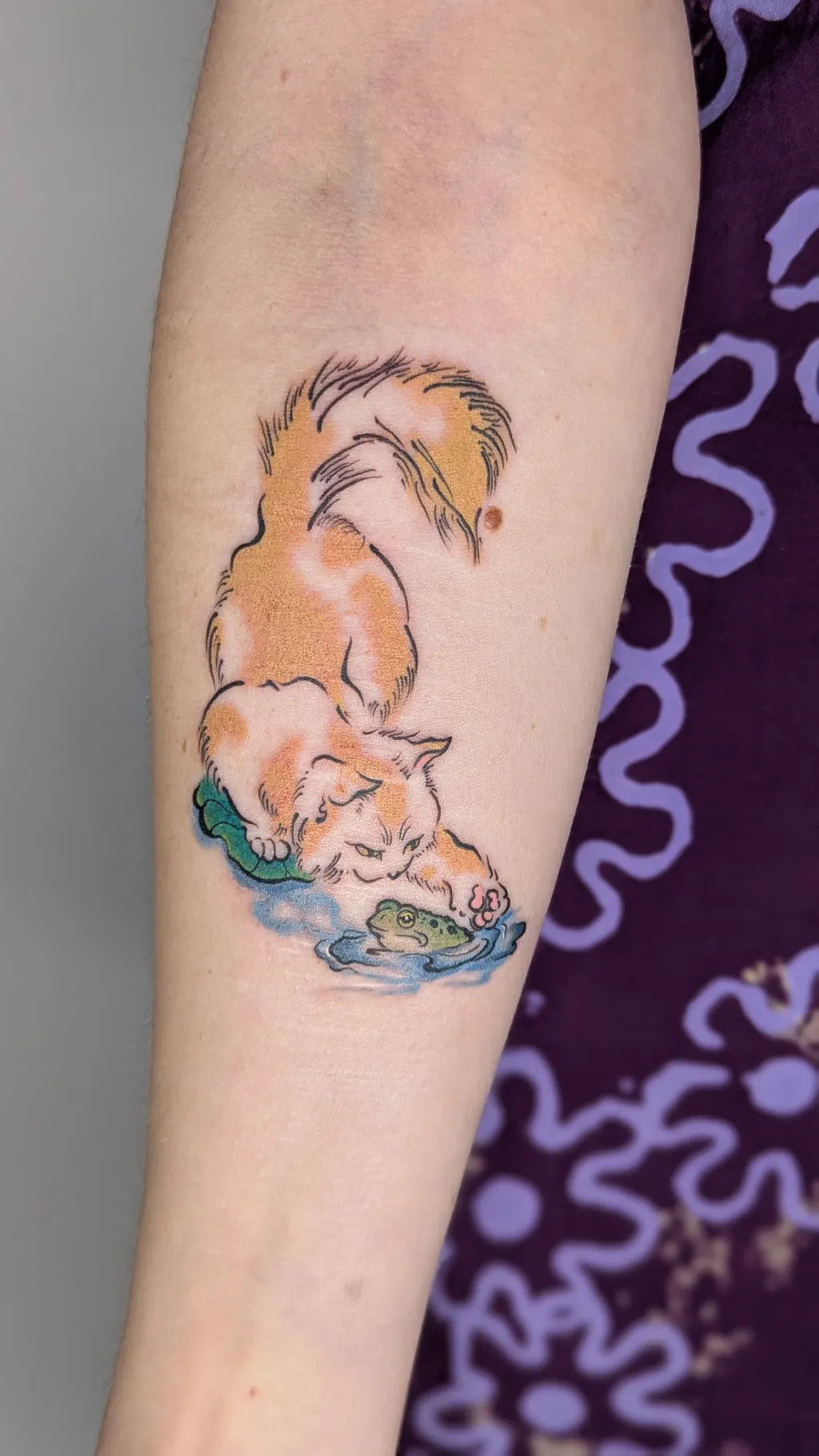 Specialising in Japanese-influenced illustrative work, Eggy blends traditional motifs with bold brush-stroke linework to create tattoos that feel alive on the skin. Inspired by Ukiyo-e, she pairs sweeping, confident lines with delicate textural strokes, capturing movement, gesture, and emotion in every piece. Whether depicting dynamic creatures, adorable critters, or rhythmic botanicals, Eggy’s work emphasises contrast, rhythm, and the fluid energy of hand-painted art.