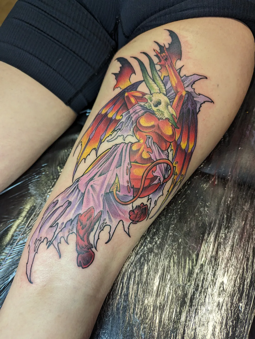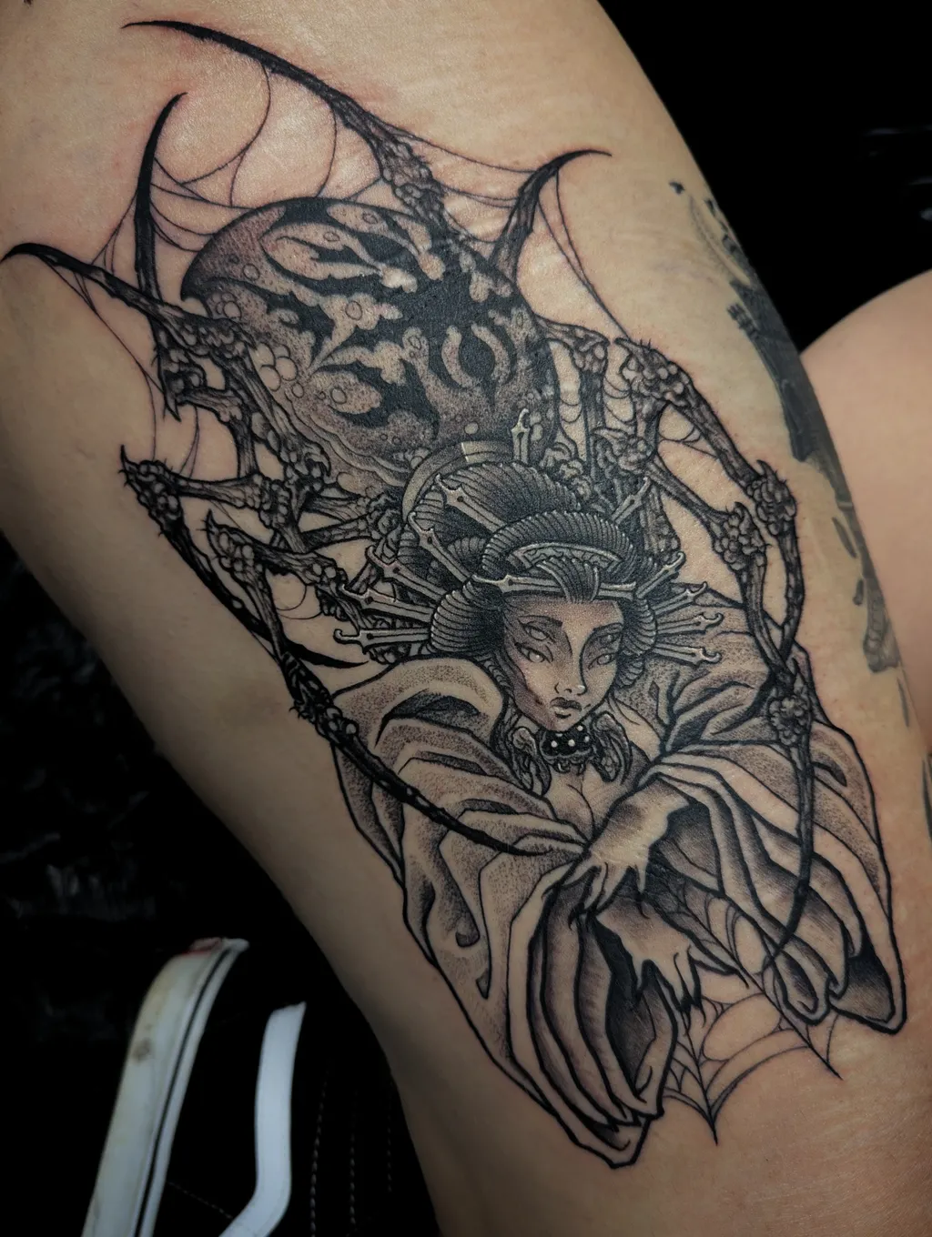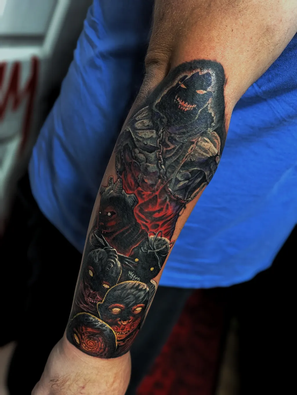 Godrot is known for his horror-inspired, illustrative work that blends eerie atmosphere with dynamic composition. From full-colour nightmares to striking cover-ups, his tattoos balance darkness, detail, and design in perfect unholy harmony.
