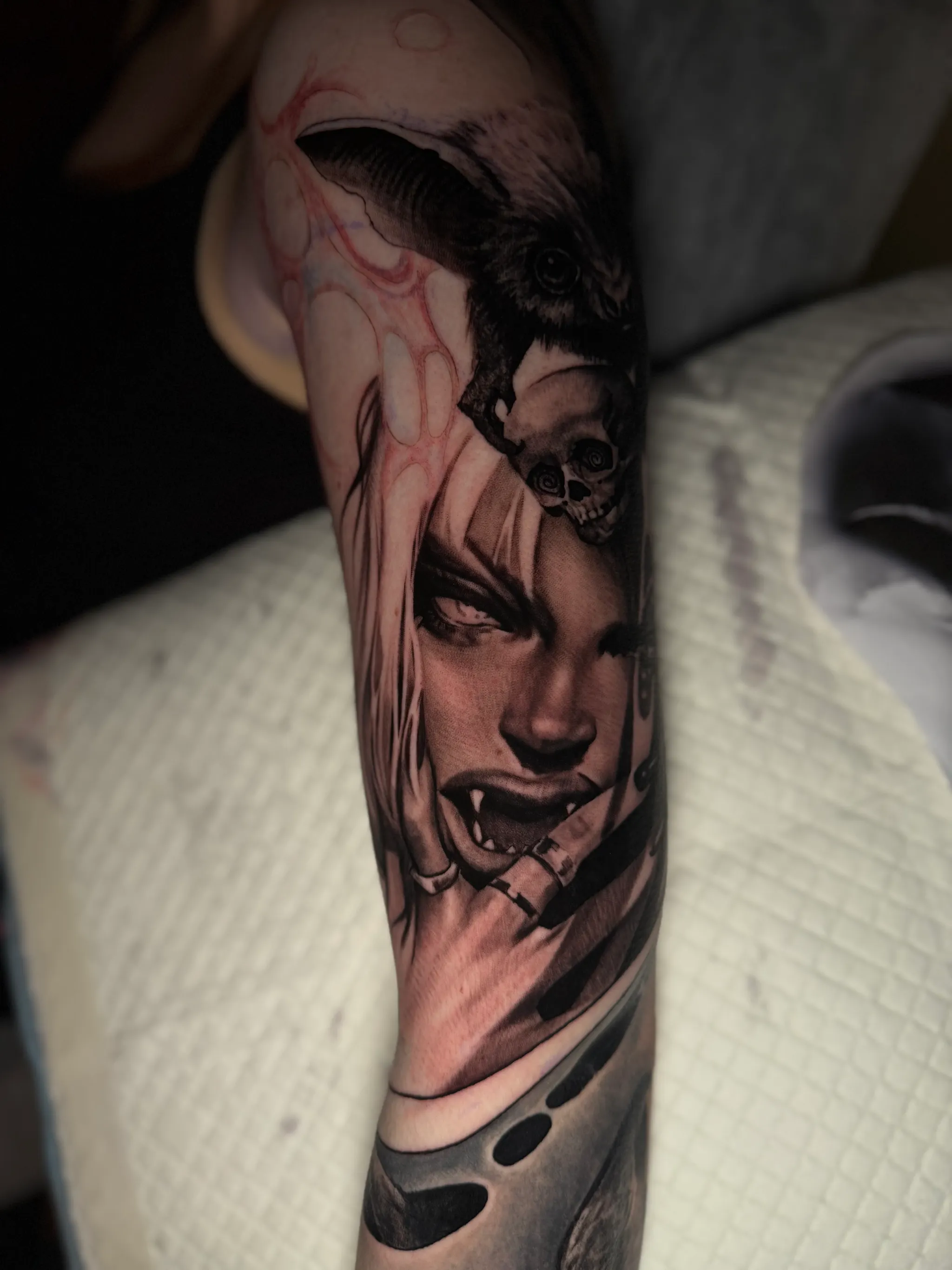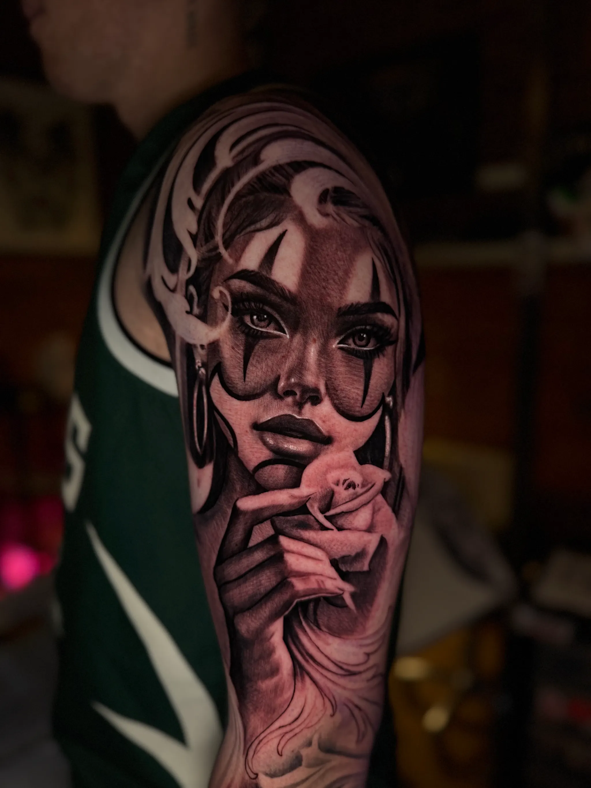 Specialising in black and grey realism and portrait work, Tonia brings an artistic vision that merges technical precision with creativity and emotion. Her evolving style incorporates dark surrealistic elements, crafting tattoos that are as thought-provoking as they are beautifully executed.