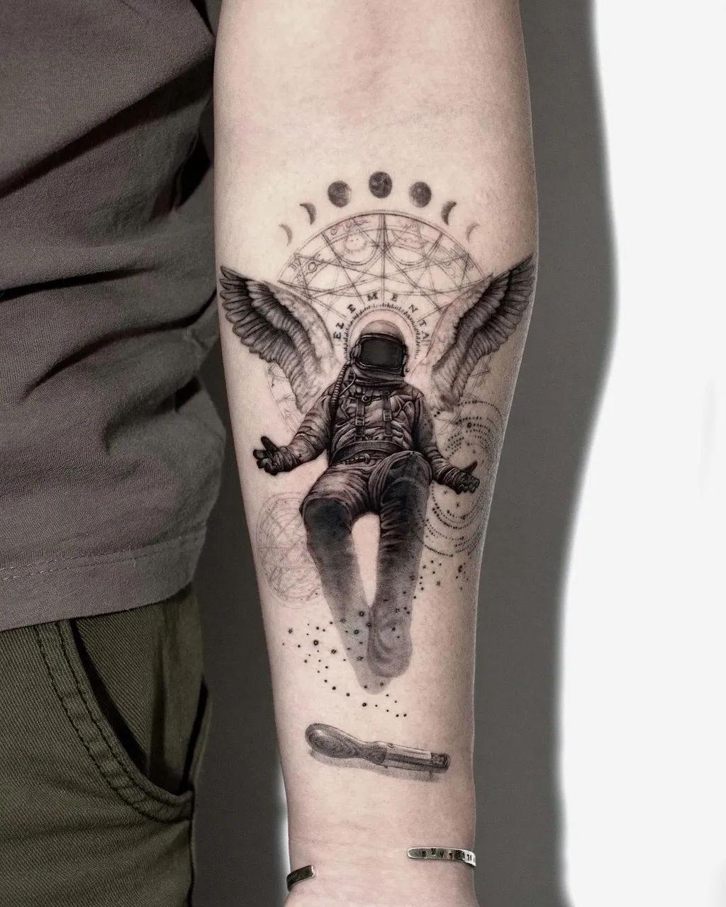 Known for his black and grey realism, Young Gi specialises in micro-realism and conceptual fine line designs that blend technical accuracy with artistic imagination. His work often explores classic subjects such as skulls, swords, statues, vintage illustrations and executed with depth, clarity, and atmospheric contrast. He’s also recognised for his signature astronaut tattoos, weaving symbolism and narrative into each piece.